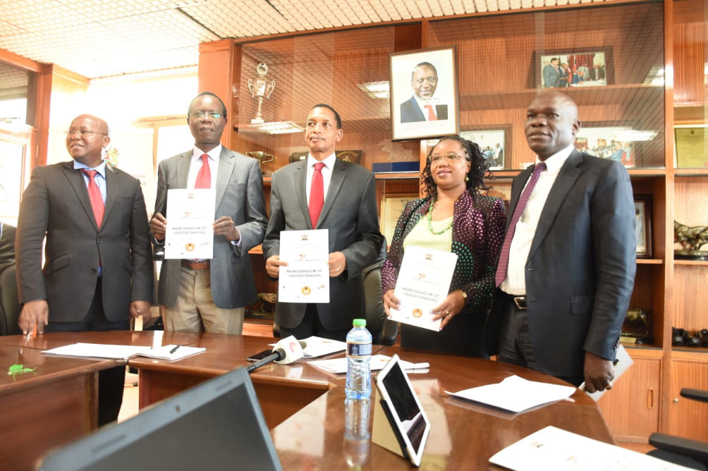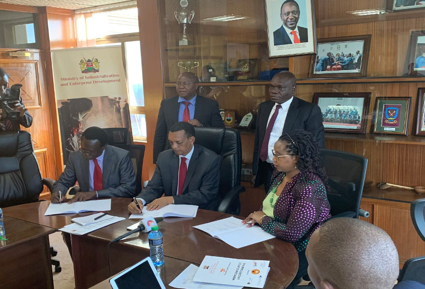 Kenya Industrial Estates Managing Director Dr. Parmain ole Narikae joined the Chief Administrative Secretary in the Ministry of Industry, Trade and Enterprise Development Mr. Lawrence Karanja, PS for Industrialization Dr. Francis Owino in signing of an MOU between patner agencies (KIE, IDB CAPITAL, ICDC, MSEA & KNTC) for the implementation of the Stawisha SME mashinani initiative that was launched on Friday 31st January, 2020 by H.E President Uhuru Kenyatta in Olkalao, Nyandarua County.